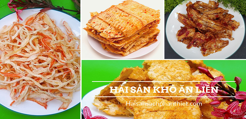 Hải sản khô ăn liền là thực phẩm chế biến sẵn, có thể ăn ngay với đóng gói và bao bì tiện lợi. Đặc biệt, là sản phẩm hoàn hảo cho các tín đồ của hải sản khi đi dã ngoại. Chỉ cần lựa chọn, và xếp chúng vào ba lô, mang đi đến buổi dã ngoại thật nhẹ nhàng. Với các tín đồ mê cá, bạn có thể lựa chọn Cá Cơm Sấy Giòn ăn liền, Cá Kèo Rim ăn liền, Cá Mai Tẩm Mè, Cá Bống Cắt Nướng ăn liền, Cá Khoai rim ăn liền, Cá Đù cháy tỏi…Với tín đồ thích hảo Mực thì có thể lựa chọn Mực Rim Me, Mực xé giòn ăn liền, Mực xé tẩm gia vị. Nếu ai đã nghiện những tiếng kêu rôm rốp giòn tan, mà đậm đà hương vị có thể chọn Ghẹ Sữa rim ăn liền, Ghẹ tẩm sấy giòn. Ruốc sấy ăn liền có thể kết hợp với xôi trắng, bánh mì, cơm trắng cho bữa ăn chính nếu không có thời gian chế biến.