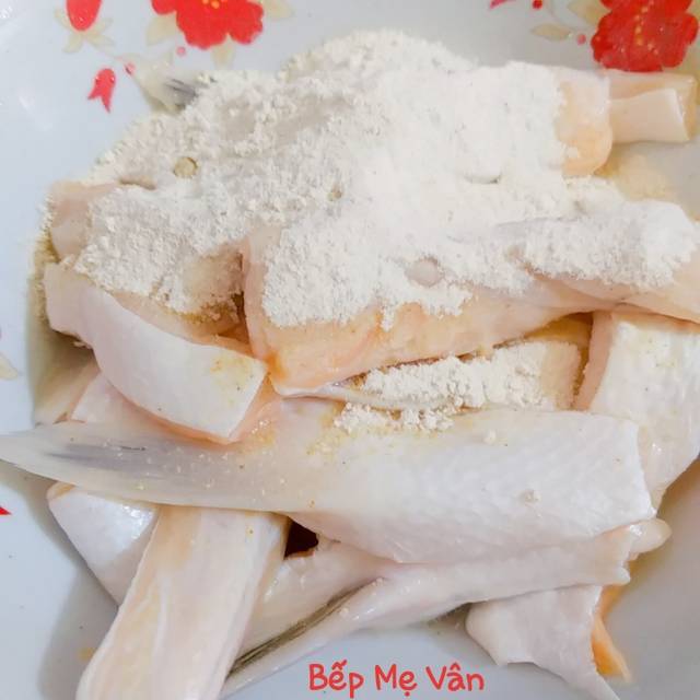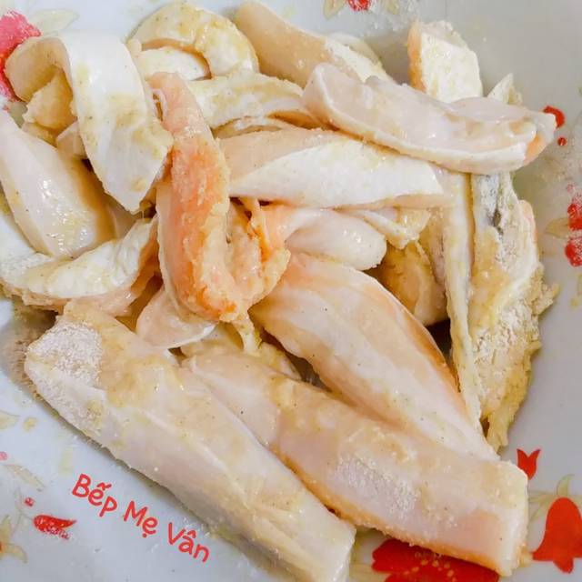 - Cá hồi cạo lớp vẩy cho sạch rồi rửa với nước muối pha loãng,rửa lại với nước cho sạch rồi để ráo và cắt đoạn ngắn vừa ăn.Cho bột tẩm khô chiên giòn Aij-Quick vào trộn đều.