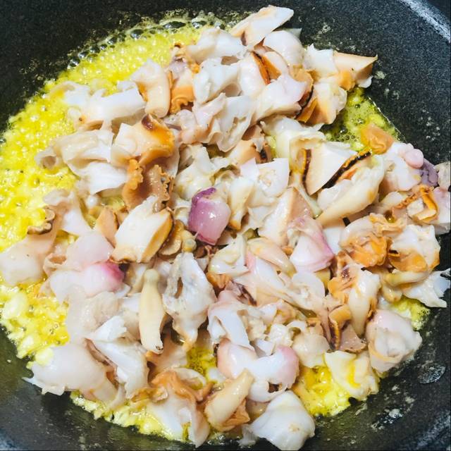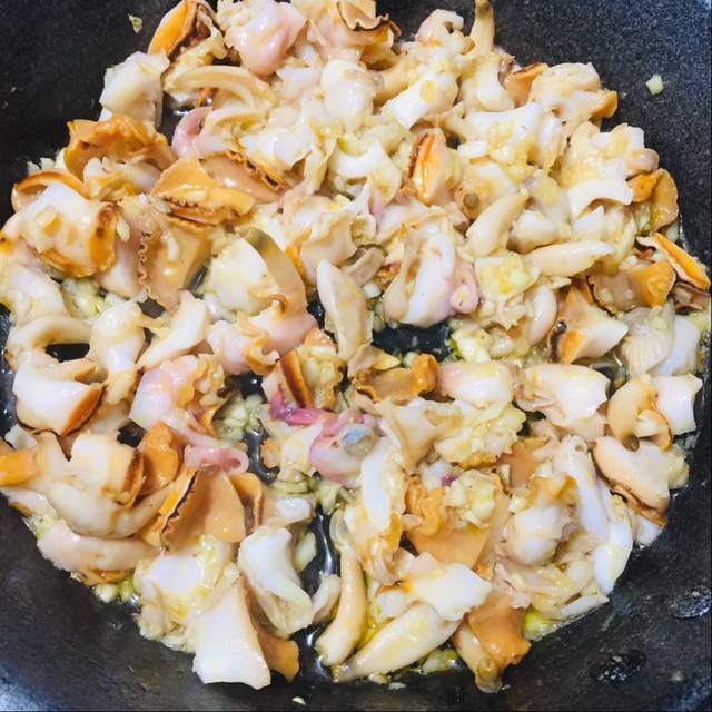 Cho chảo lên bếp cùng với bơ tỏi. Bật lửa vừa và xào đến khi tỏi thơm và chuyển sang vàng nhẹ thì cho ốc vào.