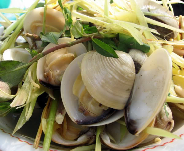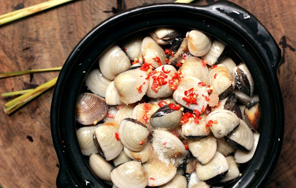 - Nghêu hấp sả dùng nóng chấm với nước mắm chua ngọt. Món ăn có vị cay của ớt, thơm của sả và ngọt từ nghêu, rất hấp dẫn.