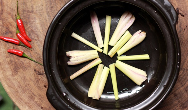 - Sả đập dập, cắt thành từng khúc khoảng 8cm, lót vào đáy nồi.